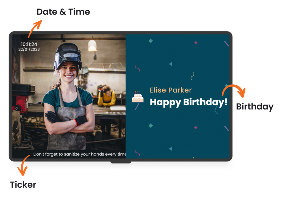 Display interesting & useful content that viewers will instantly love and appreciate, such as weather updates and news tickers. And add them to our free and fully customizable screen layout templates.
